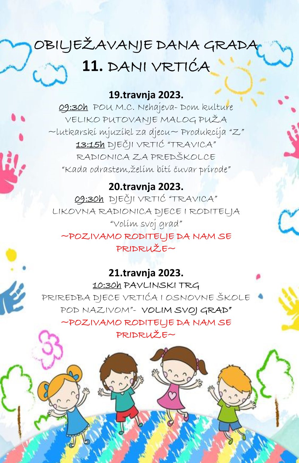 Djeca i njihovi roditelji moći će sudjelovati u raznim aktivnostima i programima koje su senjski vrtićarci sa svojim odgojiteljicama marljivo pripremili i posvetili svom gradu Senju.